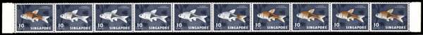 1962 10c Harlequinfish complete horizontal row of ten; the third, fourth and fifth stamps showing complete omission of red-orange, with partial omissions on the second and sixth stamps, unmounted o.g. SG 69a, £1650+