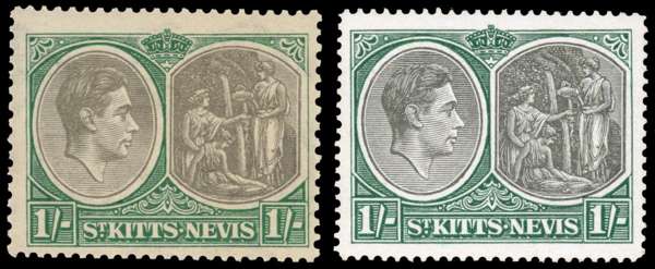 1938 1/- perf 13 x 12 and 1943 1/- perf 14, each unmounted o.g. with R3/2 break in value tablet. The 1938 stamp has normal gum toning for the issue; both are fine. SG 75a, ba, £450