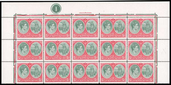 1943-50 5/- ordinary paper upper three rows of sheet with Plate 1, R2/4 break in frame above ornament, unmounted o.g. Gum slightly yellowed but still a fine and scarce multiple. SG 77b, bb, £770