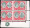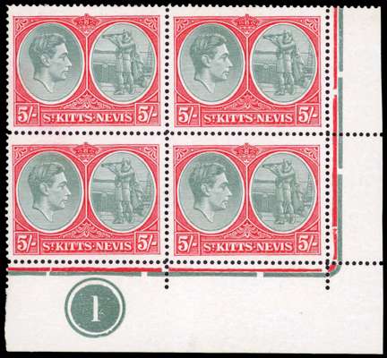 1943-50 5/- ordinary paper Plate block of four with Plate 1 and R12/5 break in oval at foot, fine unmounted o.g. SG 77b, bc. £440