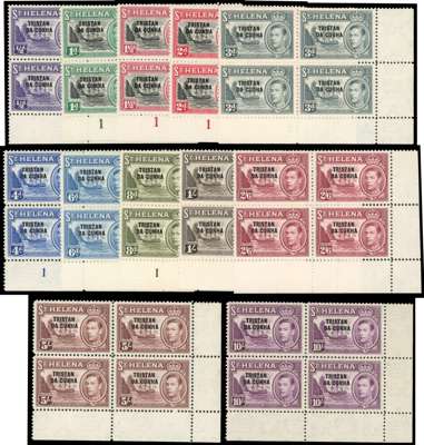 1952 set of twelve in lower right corner blocks of four, Plate numbers appearing only on the 1d, 1½d, 2d, 4d and 8d values, the balance being from unnumbered plates; fine unmounted o.g. SG 1-12, £480