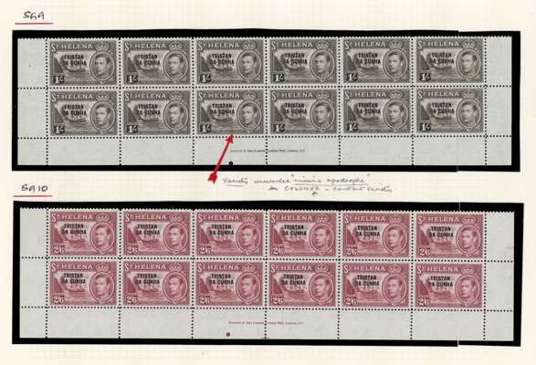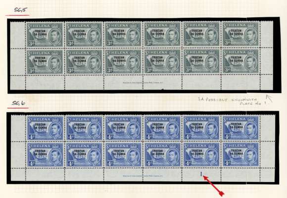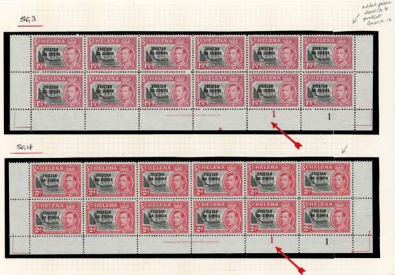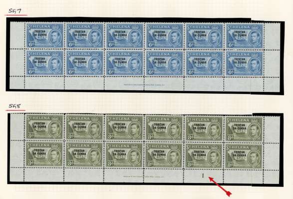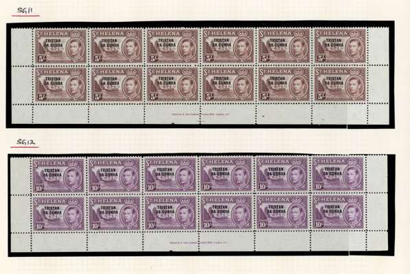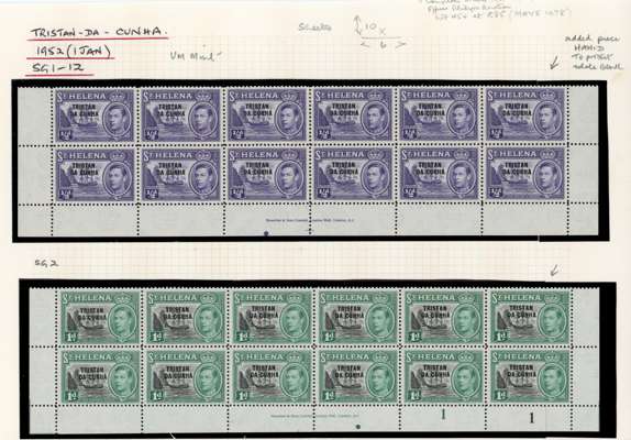 1952 set of twelve, bottom two rows of the sheets (12 sets), unmounted o.g. with imprints and Plate numbers (where printed). Includes the good 1/- R10/3 missing apostrophe variety. Fine, a good group. SG 1-12, £1680