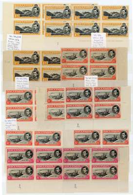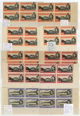 1938-47 Plate blocks (53) all values, many perfs, often left and right corners with vignette and Frame Plate numbers, mostly unmounted o.g. but nearly all with gum toned to a greater or lesser degree. Includes 1d Green Mountain (3), 3d black and ultramarine left and right, perf 13½ 1/- left and right, 2/6d, 5/- and 10/- both perfs right corners. A notable assembly despite the mixed condition. SG 38-47b