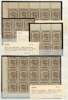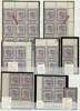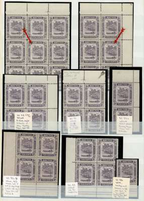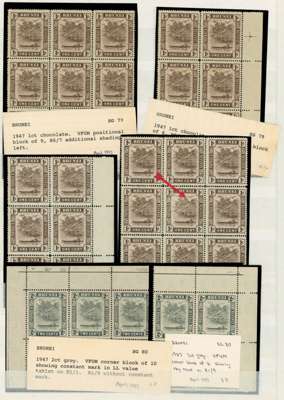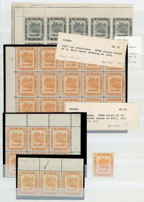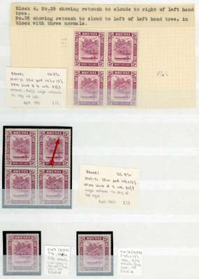 1947-51 varieties mostly in blocks, mint, mainly unmounted o.g. but mostly lightly toned. 1c blocks (8), 2c grey (2). 2c black corner block of ten with SG 80ac; 5c perf 14 block and single with R1/8 ‘5c’ retouch, perf 14½ x 13½ strip; 10c six blocks, pair and single, including major retouches; 25c block (lightly hinged) with R4/5 redrawn clouds, further block with R4/8 major retouch and two singles. SG 79/87b
