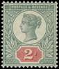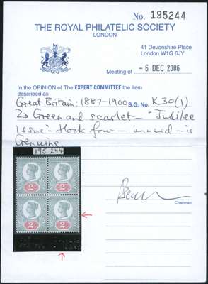 1887 2d green and scarlet, unmounted o.g. Copy of RPS Certificate (2006) when in a block of four. SG 199