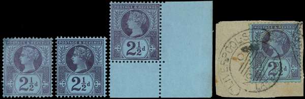 1887 2½d purple on blue paper, four examples. An o.g. example with toned spots on reverse and minor imperfections, showing a significant plate crack whose principal effect is in the head oval at right; the deep shade SG K31(3), unmounted o.g.; a corner example with watermark displacement, and a used example on piece with LIVERPOOL-STAT/ LATE BOX hooded cancel (rated 'R' by Parmenter). SG 201