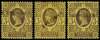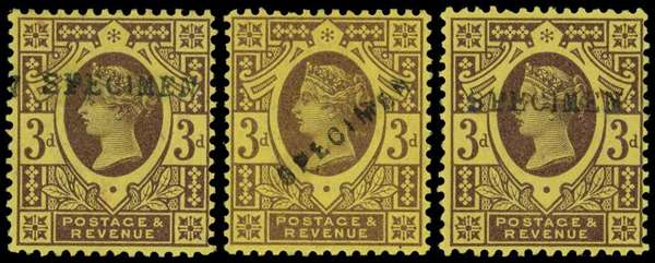 1887 3d purple on yellow paper, three SPECIMEN examples, all unmounted o.g.; two Type 9 and one Type 12. SG 202s