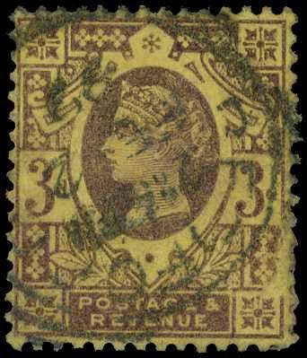 1887 3d purple on yellow paper, CDS-used with inverted watermark. Surface rub at lower right but rare with a CDS. SG 202Wi