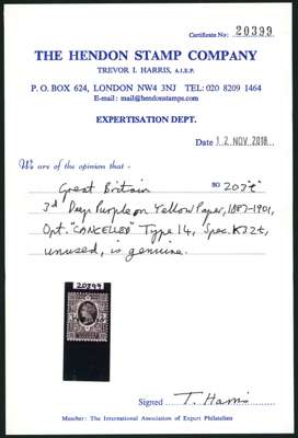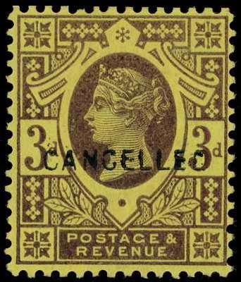 1887 3d deep purple on yellow paper, unmounted o.g., overprinted CANCELLED Type 14 Hendon Certificate (2018). 10 to 12 believed to exist, mainly in poor quality. SG 203s, K32t