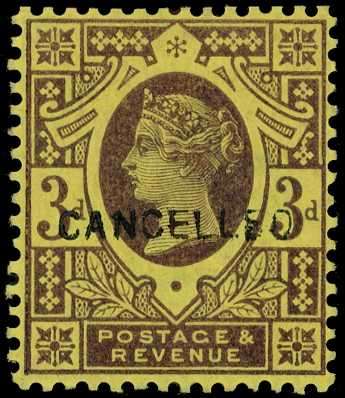 1887 3d deep purple on yellow paper, large part o.g., overprinted CANCELLED Type 14. Ex Weiss. 10 to 12 believed to exist, mainly in poor quality. SG 203s, K32t