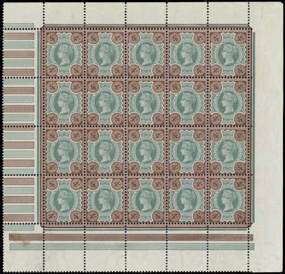 1887 4d green and purple-brown o.g. pane of twenty from Setting 5, Pane N, full margins. Hinged on the selvedge only, which has a discoloured area on the reverse at lower left. Some gum creasing, still a fine pane, ex Aureum. SG 205, K33(1)
