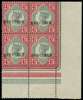 1887 4½d green and carmine overprinted SPECIMEN Type 9, corner block of four, unmounted o.g. Wrinkling and some minor separation, confined to the selvedge; a fine and very scarce multiple. SG 206s, K34(1)s