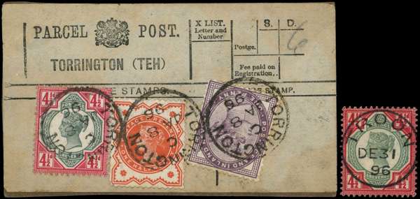 1887 4½d green and bright carmine used with very fine Troon CDS of DE 31 96, RPS-certified but certificate not present. Also the green and carmine shade together with ½d vermilion and 1d lilac on parcel post label piece, Torrington CDSs. SG 206, a