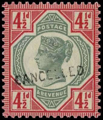 1887 4½d green and carmine overprinted CANCELLED Type 14, unmounted o.g. Very scarce. SG 206s, K34t