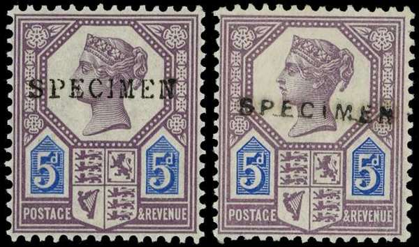 1887 5d dull purple and blue, Die I. Two unmounted o.g. examples overprinted SPECIMEN, Type 9 (ex Aureum) and the scarcer Type 12. SG 207s