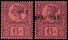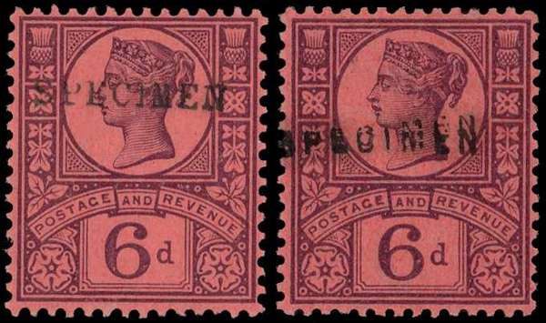 1887 6d deep purple on rose-red paper. Two unmounted o.g. examples overprinted SPECIMEN, Types 9 and 12, fine and fresh. SG 208s