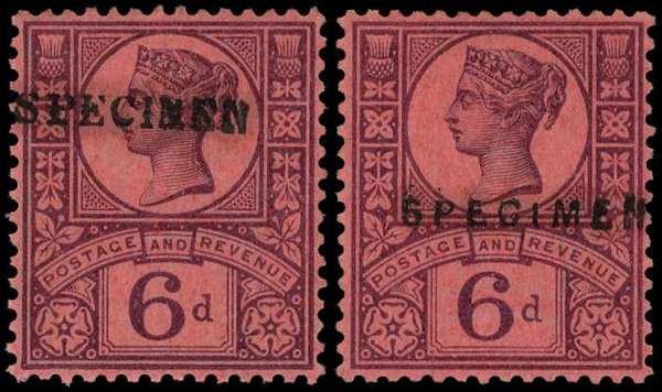 1887 6d deep purple on rose-red paper. Two unmounted o.g. examples overprinted SPECIMEN, Types 9 and 12, fine and fresh. SG 208s