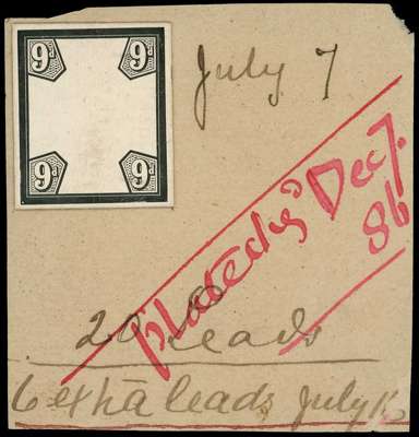 1887 Die Proof of the 9d Duty Plate, cut to stamp size and mounted on buff card (55 x 58mm). Endorsements; in black 'July 7 20 Leads/ 6 extra leads July 16' and in red, 'plate chgd Dec 7 86'. A unique proof, ex DLR Archive and Aureum. For SG 209