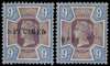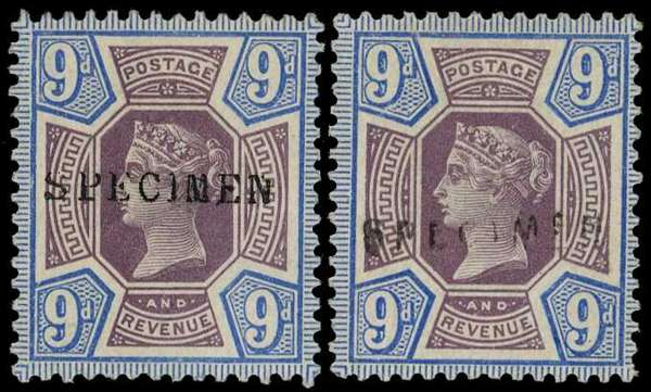 1887 9d dull purple and blue, two unmounted o.g. examples overprinted SPECIMEN Types 9 and 12, the latter scarcer. SG 209s