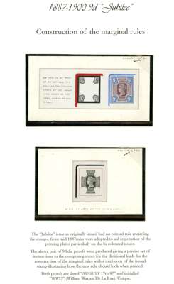 1897 9d dull purple and blue Die Proofs of the marginal setting. Sunken proofs of the Duty and Head Plates, the Duty proof with an issued stamp alongside (marginal rules were introduced from mid-1887, so issued stamps were available). The Head Plate proof endorsed DIVISION LEAD OF THE OUTER LINE, with marginal line drawn in (set wide); the Duty Plate proof endorsed THE RED TO BE MADE UP BY CUTTING THE EDGE ON THE DIVISION LEADS OF THE INNER LINE DOWN TO THE SAME PLANE AS THE LINE, with marginal lines added (in red) to the proof, set close, and in blue to the issued stamp. Each dated AUGUST 19TH 87 and initialled by William Warren De La Rue. A unique set of instructions to the composing room, ex Stothert and Aureum. SG 209