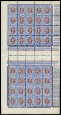 1887 9d dull purple and blue double pane of forty (vertical format) with full margins. Some marginal wrinkling, the stamps appear very fine unmounted o.g.; trifling separation along the central horizontal line of perfs, a splendid multiple. SG 209