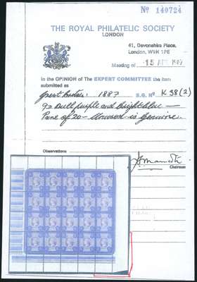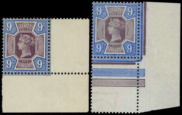1887 9d (deep) dull purple and (deep) blue lower right corner example, from the first or second setting, without marginalia; the stamp unmounted o.g., a rare item. Matched with a corner example of the dull purple and bright blue shade (K38(2)), unmounted o.g., with copy of RPS Certificate (1987). A very attractive pairing. SG 209