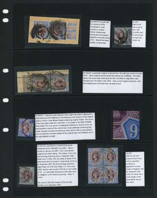 1887 9d dull purple and blue small used group. Early use, a single with Harrogate CDS of JA 21 87; block of four with two strikes (contrary to regulations) of Cannon Place Brighton CDS; example with violet cancel in the deep intense blue shades; separated corner pair and marginal pair with interpanneau bars (scarce, although scruffy and/or heavily postmarked), and a Govt. Parcels pair with rubber Sunderland CDSs. SG 209, O67