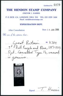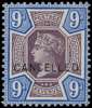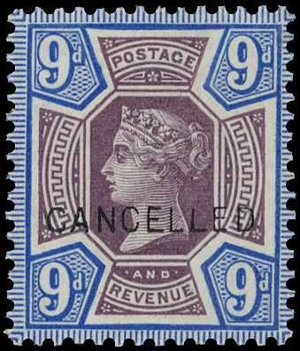 1887 9d dull purple and blue large part o.g., very lightly hinged, overprinted CANCELLED Type 14. Rare. Hendon Certificate (2009). SG 209s, K38t