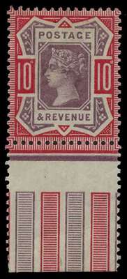 1887-92 10d dull purple and carmine bottom marginal example showing pillars and no jubilee line, large part o.g., from Setting I; very scarce in this proving format. SG 210