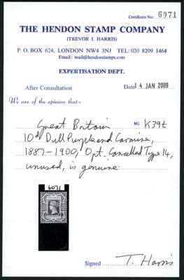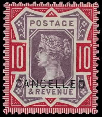 1887 10d purple and carmine overprinted CANCELLED Type 14, fine large part o.g., very lightly hinged. Rare. SG 210s, K39t