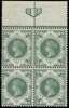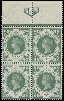 1887 1/- green top marginal block of four showing full divisional ornament, unmounted o.g. With Jubilee line and full divisional ornament, minor bends otherwise fine and very scarce. SG 211