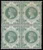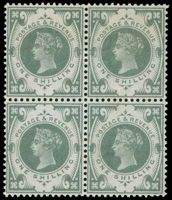 1887 1/- dull green with watermark inverted, o.g. block of four with the upper pair lightly hinged and the lower pair unmounted. Some very light gum creasing, of very little consequence, an extremely rare multiple. Ex Aureum. SG 211Wi