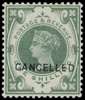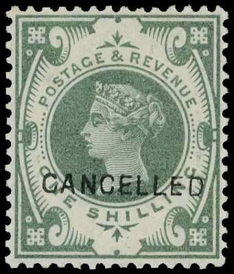 1887 1/- dull green overprinted CANCELLED Type 14, very fresh and lightly hinged. Ex Aureum. SG 211s, K40(1)t