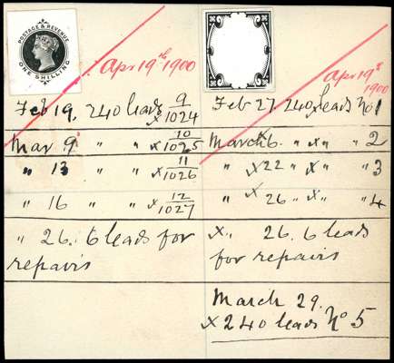 1900 1/- Die Proofs of the Head and Duty Plates in black on card, each cut to stamp size and mounted on a striking book piece (110 x 102mm), annotated with details of all the Leads taken between 19th February and 29th March. A splendid piece, ex DLR Archive, Aureum and Redcentre. For SG 214
