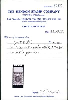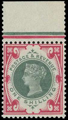 1900 1/- green and 'carmine-pink' top marginal, unmounted o.g. Quite a distinctive shade, Hendon Certificate (2019). SG 214 var