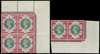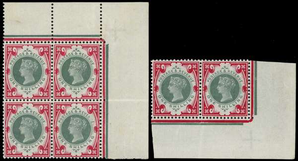 1900 1/- green and carmine top right corner block of four (horizontally folded), o.g., hinged on the selvedge only; and a lower right corner pair, o.g. with the right stamp hinged, showing a watermark shift so that the left stamp shows part of two Crowns. SG 214