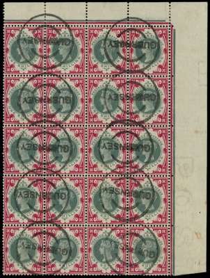 Postmarks. 1900 1/- green and carmine top right corner block of twenty, with eight strikes of the Guernsey parcel post undated cancel (contrary to regulations). Two other used blocks of twenty are known, with none larger. SG 214