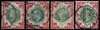1900 1/- green and carmine, CDS-used with Plate F3a R19/1 framebreak at left, slightly soiled, matched with a used KE VII 1/- showing the same variety, also soiled. Unusual with CDS. Offered with two further CDS-used examples without varieties, one with large part British Post Office MR 19 01 CDS (presumably Boer War use) and another with sideways Sheffield CDS of MR 30 01. SG 214, K41b