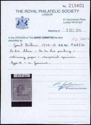 1902 2/6d lilac, unmounted o.g., overprinted SPECIMEN Type 16. RPS Certificate (2014). SG 260s