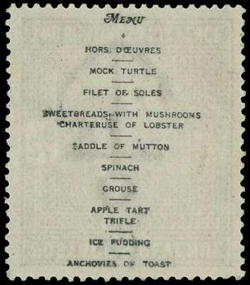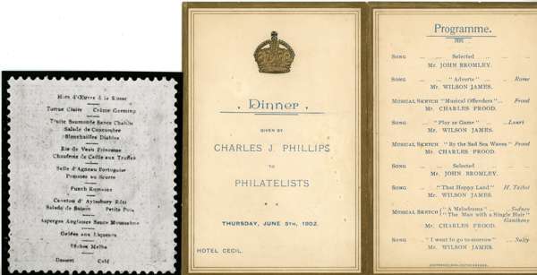 1902 2/6d lilac, unmounted o.g., underprinted (inverted) with the menu for Charles J. Phillips' Dinner at the Hotel Cecil, 5th June 1902. Together with two cards, one with the wine list on the reverse, and the other listing the programme of entertainment. SG 260 var