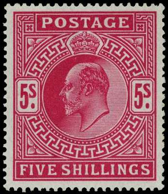 1902 5/- bright carmine, unmounted o.g. Fluoresces 'cherry red' under ultraviolet, indicating early 1902 printing. SG 263 var