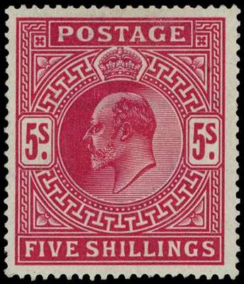 1902-12 5/- deep bright carmine, unmounted o.g., light overall toning on reverse. SG 264