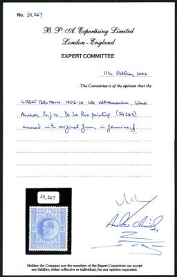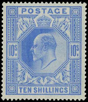1902 10/- ultramarine unmounted o.g., light overall toning on reverse. Clear BPA Certificate (2002). SG 265