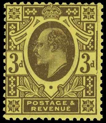 1911 3d purple on lemon paper, unmounted o.g., Pl. 4 R9/12 frame broken at right, fine, scarce in this condition. SG 277 var, M21e