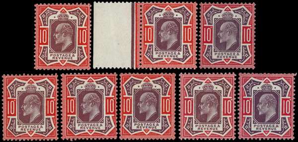 1911-13 Somerset House 10ds (8), unmounted o.g. SG 309-311, 310 being left marginal; M44(1), (3), (4), (7), (8)