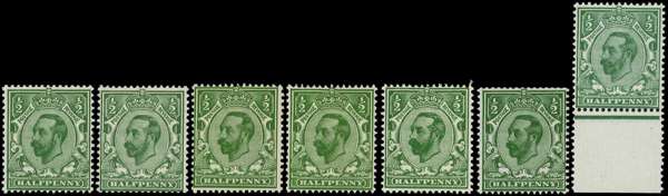 1911 ½d Die B specialised shades (7), unmounted o.g., the bluish green a lower marginal example; the pale bright green and yellow-green each slightly toned on reverse, otherwise fine. SG 324-6 var, N2(1-6, 8)