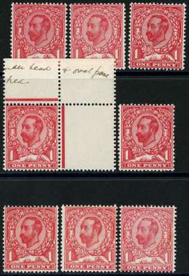 1911 1d Die B specialised shades (8) of the carmine and rose-pink groups, unmounted o.g., complete. SG 329-331, N8(1-8)