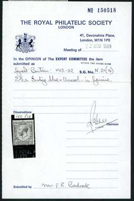 1912-24 2½d indigo-blue unmounted o.g., good colour and very fine save for a light bend. RPS Certificate (1989); rare. SG 373