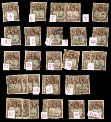 1924-33 1/- grey-black and brown used positioned examples (30, from 21 different positions), mainly fine. SG 18