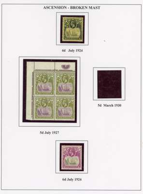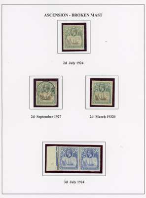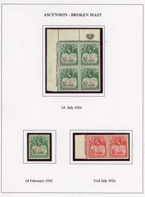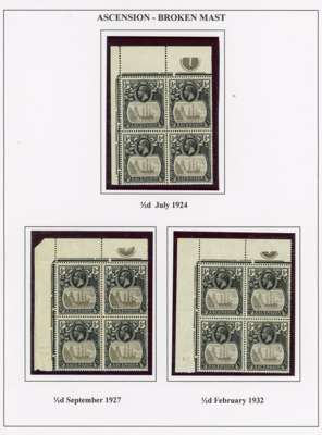 1924-33 set and additional printings with R2/1 broken mast, mint unless stated. ½d 1924 Plate block, slight splitting, stamps unmounted, 1927 Plate block stamps unmounted, 1932 Plate block, stamps unmounted, R1/1 with crease; 1d 1924 Plate block, stamps unmounted, 1932 single with fault at top left, this area slightly foxed on reverse; 1½d 1924 marginal pair, foxing which only just affects the variety stamp; 2d 1924 single, 1927 single faulty used, 1932 single; 3d 1924 marginal pair unmounted, the variety with minor foxed spot; 4d 1924 single; 5d 1927 Plate block, crease which is not readily apparent; 6d 1924 unmounted single; 8d 1924 pair unmounted, the variety with minor foxed spot; 1/- 1924 single; 2/- 1924 single, foxed on reverse; 3/- 1924 single, creased. SG 10a-20a, £6620 (a couple not counted)